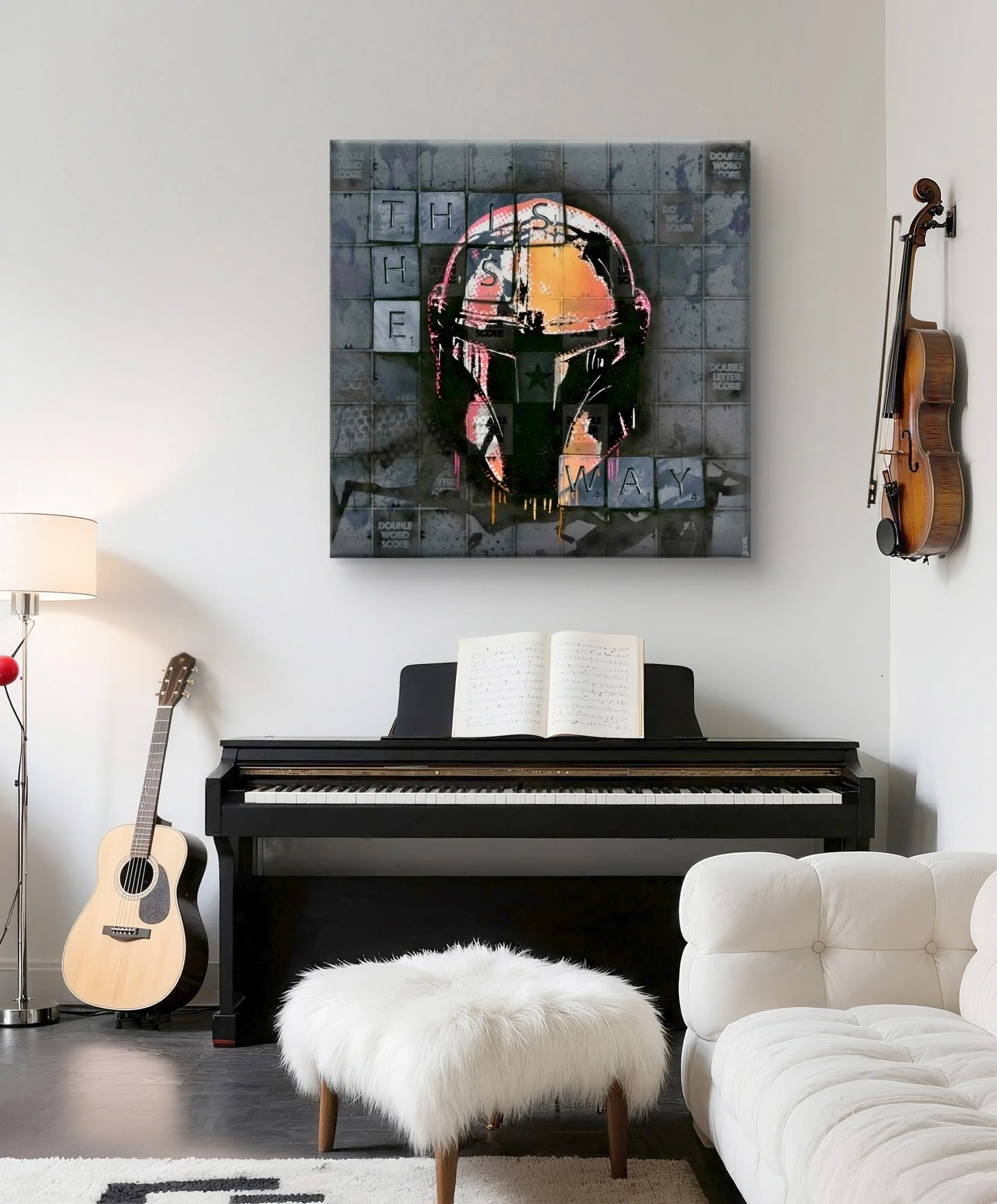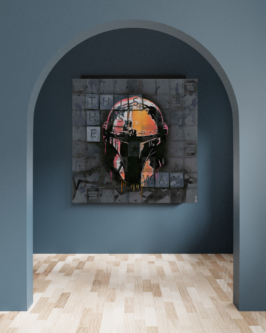 “This Is the Way” reimagines the Mandalorian’s helmet with a bold fusion of pop culture and street-art aesthetics. The iconic form emerges in vibrant tones of orange and gold, set against a dark style grid where the phrase “THIS IS THE WAY” is spelled out. Blending nostalgia, contemporary texture, and cinematic symbolism, the piece transforms a legendary image into a striking collectible.v