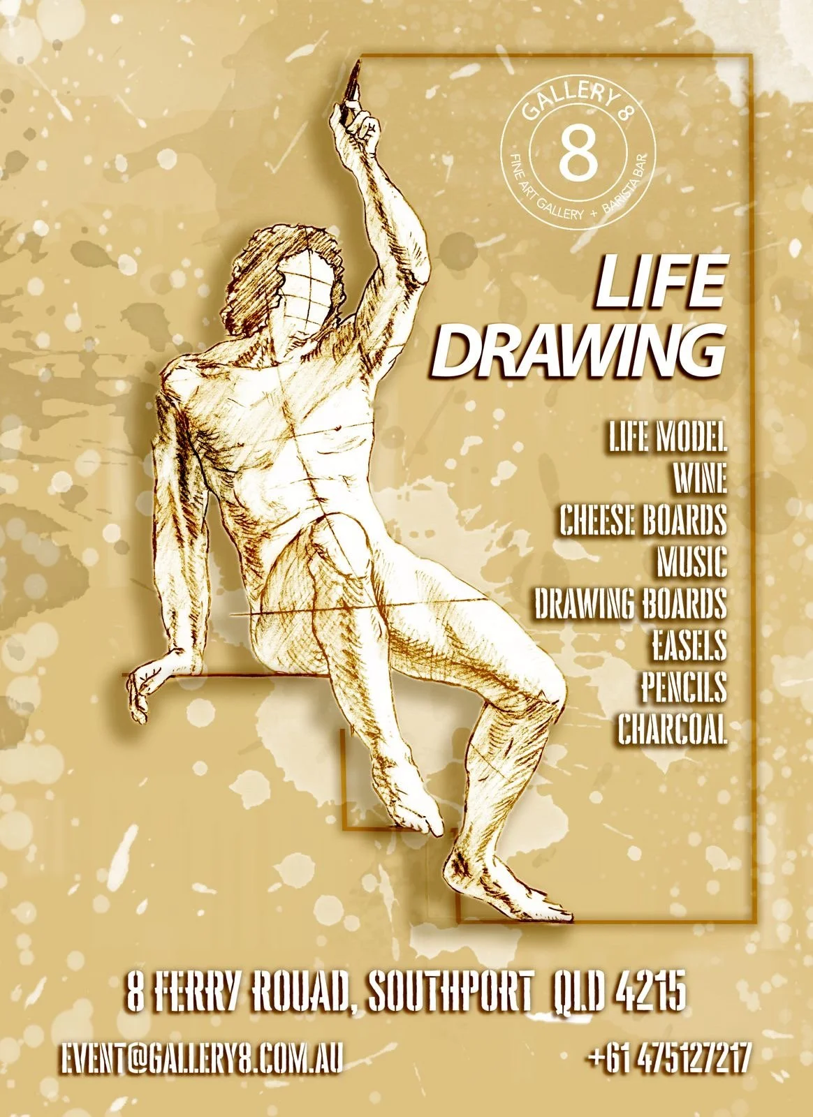 Life Drawing at Gallery 8 Southport runs regularly, check our Events page or Google Business listings for upcoming dates. Some sessions coincide with art exhibitions, pop-up shows, or happy-hour drinks in the café. Additional Art supplies are available to purchase at the Gallery if you like.