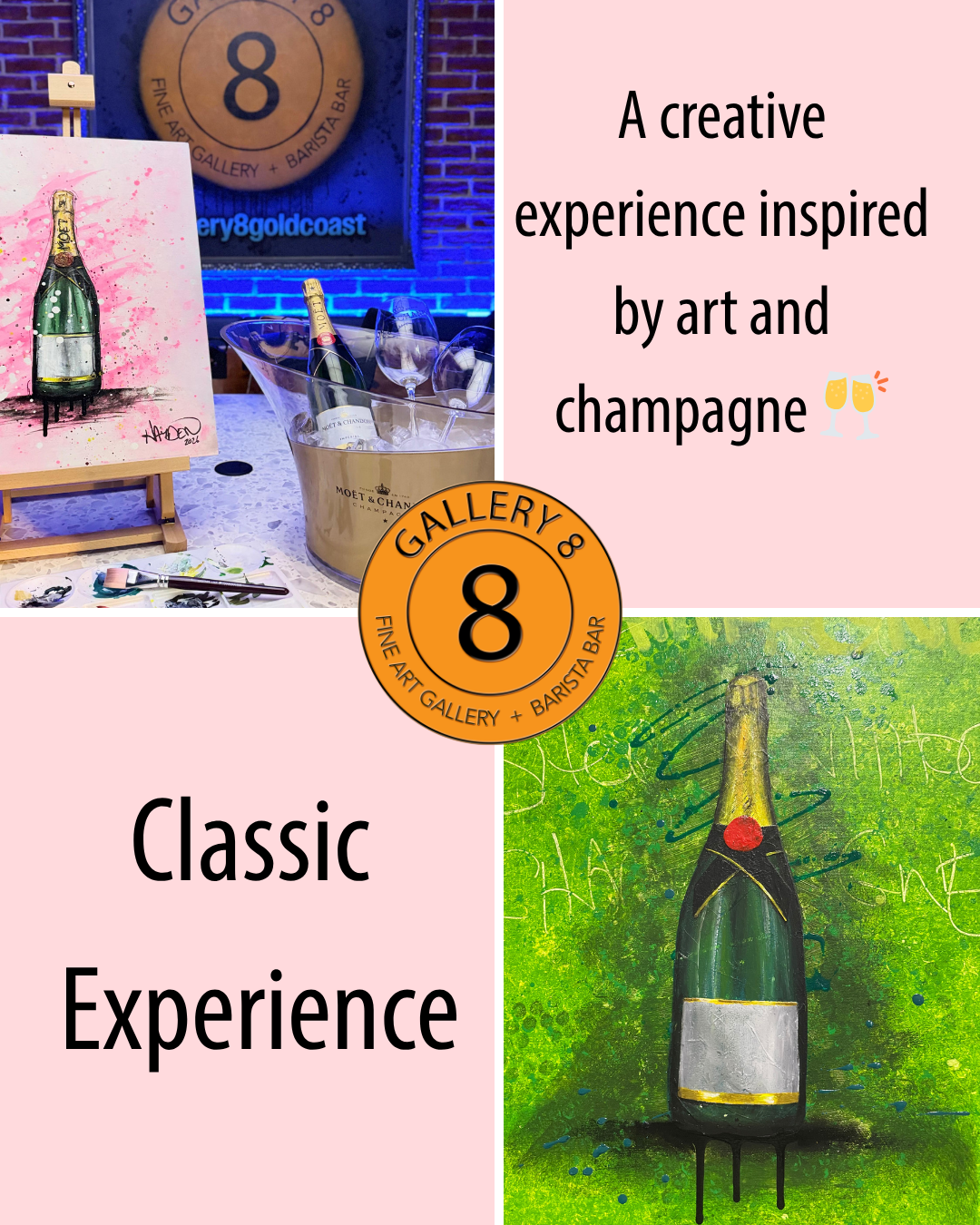 Champagne Creations at Gallery 8 is more than just a paint and sip - it’s a premium, feel-good experience designed to help you create something beautiful. What to Expect